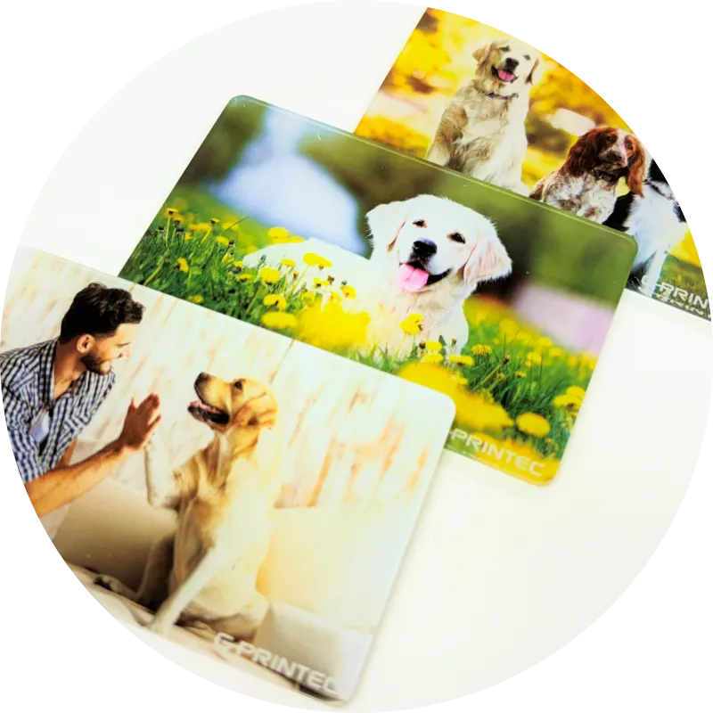ホワイトとメタリックの組み合わせにより、透明アクリルカード上で鮮明な印刷を実現。